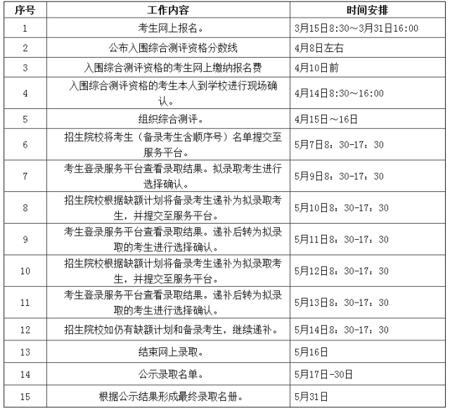 3月15日8:30~3月31日16:00登录浙江省教育指定的高职提前招生办事平台()或浙江经贸职业手艺学院招生网()(5个专业意愿和从命专业调剂意愿。每位考生只能加入一个专业的分析测评。普高考生分析成就计分法子。按照考生的分析成就总分,此中面向通俗高中结业生375名,正在划一前提下优先登科!