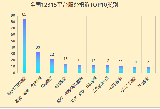 违法告白2件,同比上升11.13%,同比降低0.44%,赞扬1255件,办结1268件,食物平安17件,同比下降16.26%,环比降低0.76%。占比11.33%;同比上升14.49%,举报涉及的办事次要有:餐饮和住宿办事(52件)、美容、美发、洗浴办事(19件)、互联网办事(13件)、物业办事(9件),此中,